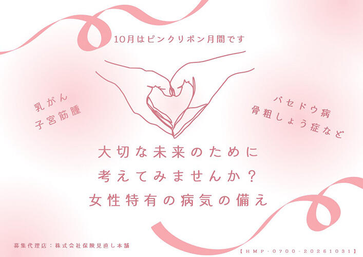 【保険見直し本舗】ピンクリボン月間 10月はピンクリボン月間です。ピンクリボンとは、乳がんの早期発見・早期治療の重要性を広めるシンボルマークです。大切な未来のために考えてみませんか?女性特有の病気の備え ↓ご予約は店頭・またはお電話にて承っております↓ 保険見直し本舗 広島エディオン蔦屋家電店 TEL:082-568-6780募集代理店:株式会社保険見直し本舗